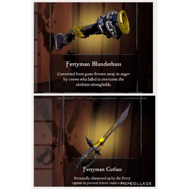 The bundle includes the cursed ferryman blunderbuss, cutlass, eye of reach, and pistol. Why wasn't there an eye of reach included with the ferryman set? They are not owed, nor are they deserving. The weapons are sure to be as deadly as the animals they are shaped after. Complete tomb of the ferryman in under 7:00 (copper spirit of shen and heb) collect 5 red skulls (restricted copper ring of haste) cross the spike ball river without touching the water (solar copper ring of strength) use the trap platforms to dunk an enemy (max ammo upgrade) destroy the wall without grabbing the time bomb (max health upgrade) The ferryman shows little interest in mortals who dwell on the surface. The eye of reach has a cartridge of 5 shots that need to be reloaded at an ammo chest or an armoury once empty. Weapons can be accessed and swapped from the armory located on the player's ship. @faceyourdemon meeting the terms of an offer does not grant anyone exclusive/free access to any future offerings unless explicitly stated, which it wasn't.